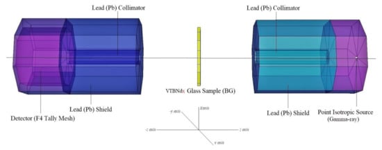 Mass attenuation coefficients (MAC) of the 74.75TeO2–0.25V2O5–(25 − x)B2O3–xNd2O3 (x = 0, 0.5, 1, 1.5 mol%) glass system were determined using Phy-X PSD [19] code and MCNPX [20,21,22] Monte Carlo code. Tellur-based glasses usually start to deteriorate and burn at high temperatures (about 900 °C) and accordingly they become a blackish color. The synthesis temperature rises when Nd2O3 rises above certain ratios. Therefore, the Nd2O3 reinforcement amount is kept at low rates so as not to exceed high temperatures. The main priority was a consideration of their elemental mass fractions (wt%) and material densities (see Table 1). The results of MAC determination obtained from Phy-X PSD and MCNPX can be seen in Table 2. Overall, average MAC values were obtained in a clear pattern and consensus. However, different smooth findings were recorded between the Phy-X-PSD code and the MCNPX Monte Carlo code. This situation can be clarified by the kinds of processes and physics lists MCNP uses in Monte Carlo simulation and random event generator for a process of radiation transport, while Phy-X PSD is a mechanism that uses statistical equations for direct determination of MAC values. Moreover, its worth mentioning that MAC values used in Phy-X PSD calculations are taken from the NIST (National Institute of Standard and Technology) database. There is no direct outcome to record MAC values in MCNPX code, but another sub-calculation is done through analysis of the output file. Monte Carlo simulations were generated by incorporating the main details, including input files, cell cards, and source information. Glass samples were determined ın terms of their elemental mass percentage, material density, and geometric shape. In respect to radiation interaction, we must discuss the concerns of shielding and nuclear protection. Data on the simulation must be detailed in a systematic graph. The expertise required to describe physical quantities and identify the specific input point. The arrangement of the gamma-ray emitting systems can be seen in Figure 1. In this measurement, the accurate F4 Tally mesh was used. This approach allows for the analysis of the average photon flux in a cell. Moreover, a point isotropic source was defined as a gamma-ray emitter. Mass attenuation coefficients of studied glasses were determined in few stages such as definition of gamma-ray transmission setup, simulation run, and analysing of outcome file. The gamma-ray transmission setup was designed considering the experimental conditions, where the terms of collimation and Pb shields are important. The 3-D view of gamma-ray transmission setup was checked using MCNPX visual editor. Initial checks showed that this model does not have any geometric errors or design problems. The simulation run was repeated for every single glass sample at different gamma-ray energies. Finally, a detailed analysis was performed in output file. To measure the attenuation coefficient, promary and secondary gamma-ray fluxes were exported from the output file.