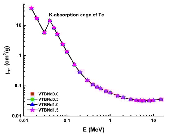 In this study, four different glass samples encoded VTBNd0.0, VTBNd0.5, VTBNd1.0, and VTBNd1.5 based on 74.75TeO2–0.25V2O5–(25 − x)B2O3–xNd2O3 (x = 0, 0.5, 1, 1.5 mol%) systems were tested for their feasibility for nuclear radiation shielding utilizations. The experiments on optical and structural properties were widely reported, which included alloys of different composition. In a previous paper, Kilic [1] discussed the effect of B2O3 and Nd2O3 substitution on the optical, structural, and thermal properties of these glass samples. He discovered a personal association between Nd2O3 reinforcement and the optical properties and thermal and structural properties of 74.75TeO2–0.25V2O5–(25 − x)B2O3–xNd2O3 (x = 0, 0.5, 1, 1.5 mol%) oxide glasses. To fulfil the demands of IAEA and WHO organizations, the importance of alternative shielding materials is rising. This study attempted to investigate the connection between the intriguing results in the Nd2O3 reinforced oxide glasses and their nuclear radiation shielding properties. A first move was made in evaluating availability concentrations for alloys in a 0.015–15 MeV range, using a general-purpose Monte Carlo method and Phy-X software. The selected energy range is a standard energy range of theoretical gamma ray shielding calculations, where the critical behaviors at the low, middle, and high energy region depending on dominant interaction processes such as photoelectric effect, Compton scattering, and pair production can be observed. The word ‘LAC’ (µ) is used to measure the shielding efficacy of glass samples. Density relies on the effectiveness of shielding compounds and the energy of the gamma rays. Figure 2 shows the interaction between the photon energy of VTBNd0.0, VTBNd0.5, VTBNd1.0, and VTBNd1.5 samples. In Figure 2, the energy zone’s effect on the variance of the LAC value was affected by the photoelectric effect, Compton scattering, and pair production mechanisms. This result occurs due to the nature of radiation’s interaction with matter. At low energies, the LAC value is decreased because of photo adsorption. In the mid-energy region, Compton scattering was the dominant interaction in the measurement pattern. However, the highest LAC amount was calculated in the VTBNd1.5 sample, which has the highest concentration of Nd2O3. The mass attenuation coefficient (MAC) of the specified substance is density-independent and unique.