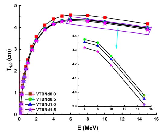 Figure 3 displays the variation of obtained MAC values against photon energy (E). A variety of gamma-ray radiation and chemical compositions of attenuator glass have changed the rate of difference of MAC values. The landscape of the MAC data reveals noticeable trends in distinct areas. In the low energy area where the photoelectric effect determines how much gamma ray is absorbed, the absorption decreased significantly. Compton scattering dominance showed statistically substantial declines from MAC values. It appears that the VTBNd1.5 sample has higher MAC values at all incident photon energies. In particular, the findings for VTBNd0.0, VTBNd0.5, VTBNd1.0, and VTBNd1.5 samples were reported as 0.4926, 0.4977, 0.5027, and 0.5075 at 0.15 MeV photon energy, respectively. Moreover, MAC values were reported as 0.0353, 0.0355, 0.0356, and 0.0358 at 15 MeV photon energy for the studied glass samples in the same order. The condition obtained in both low and high energy areas can be explained by the inclusion of the largest amount of Nd2O3 in the glass composition because of its high atomic number. Similar results were reported by Elmahroug et al. [13]. Their results showed that Bi2O3 reinforcement in the V2O5–TeO2 glass system directly increased the mass attenuation coefficients of the studied glasses. Similar to our results, an increasing reinforcement amount with higher atomic number resulted in an increment in the V2O5–TeO2 glass system. The term HVL factor is a useful quantity to evaluate the required thickness of a shield, which can reduce the intensity of the incident gamma ray by half. Therefore, a smaller HVL can be considered as a supremacy indicator in shielding materials. In this study, HVL values of the studied glasses were determined. Figure 4 shows a variation of the half value layer (T1/2) against photon energy for all glasses. In the lower energies, HVL values were reported as small. This is an expected situation for any type of shielding material as low energy gamma rays can be attenuated in low material thicknesses. However, it can be seen from Figure 4 that HVL values are higher in the high energy zone.