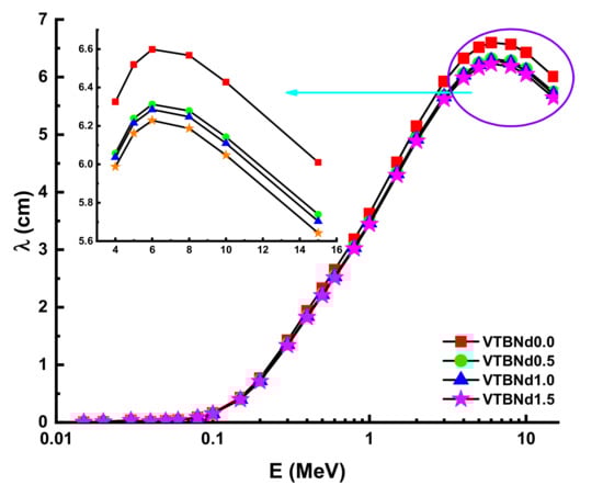 It can be explained by the penetration property of gamma rays and its dependence on energy. For example, the HVL values of the VTBNd0.0, VTBNd0.5, VTBNd1.0, and VTBNd1.5 samples at different energies were found to be 0.0041 cm HVLVTBNd0.0 > 0.0039 cm HVLVTBNd0.5 > 0.0038 HVLVTBNd1.0 > 0.0037 cm HVLVTBNd1.5 at 0.015 MeV. Moreover, HVL values were reported as 0.2992 cm HVLVTBNd0.0 > 0.2840 cm HVLVTBNd0.5 > 0.2806 HVLVTBNd1.0 > 0.2760 cm HVLVTBNd1.5 at 0.15 MeV. Finally, HVL values were reported as 4.1660 cm HVLVTBNd0.0 > 3.9777 cm HVLVTBNd0.5 > 3.9533 HVLVTBNd1.0 > 3.9106 cm HVLVTBNd1.5 at 15 MeV, respectively. As shown from this ranking, the minimum HVL values were reported for the VTBNd1.5 sample, which has the highest amount of Nd2O3 additive in its glass structure. Therefore, one can say that VTBNd1.5 requires the smallest thickness to reduce incident gamma rays by half (T1/2). The importance of the mean free path (λ) is a consideration in the gamma-protection abilities of shielding materials. The glass samples were examined, and the results are detailed in Figure 5.