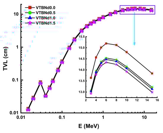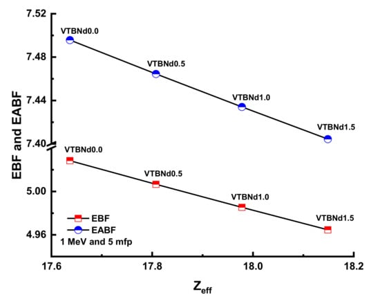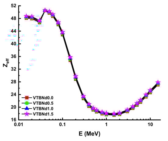 The λ values will differ similarly to the evolving pattern of HVL. The minimum λ values were recorded for the VTBNd1.5 sample. Another important shielding parameter is the tenth value layer (TVL). The term TVL factor is another essential evaluation criterion for the required thickness of a shield, reducing the intensity of an incident gamma ray to one-tenth (1/10). TVL vales of the studied glasses were determined and the results presented in Figure 6 as a function of the incident photon energy for all glasses. In the lower energies, TVL values were reported as small. A similar variation trend of HVL was also reported for the TVL values of the VTBNd0.0, VTBNd0.5, VTBNd1.0, and VTBNd1.5 samples. For example, TVL values were reported as 0.9941 cm TVLVTBNd0.0 > 0.9435 cm TVLVTBNd0.5 > 0.9323 TVLVTBNd1.0 > 0.9170 cm HVLVTBNd1.5 at 0.15 MeV. Overall, the minimum TVL values were reported for the VTBNd1.5 sample, which has the highest amount of Nd2O3 additive. The required atomic number for measuring the material’s appropriateness for gamma applications is tied to the proper photon control stage. The Zeff values of the glass samples measured are shown in Figure 7.
