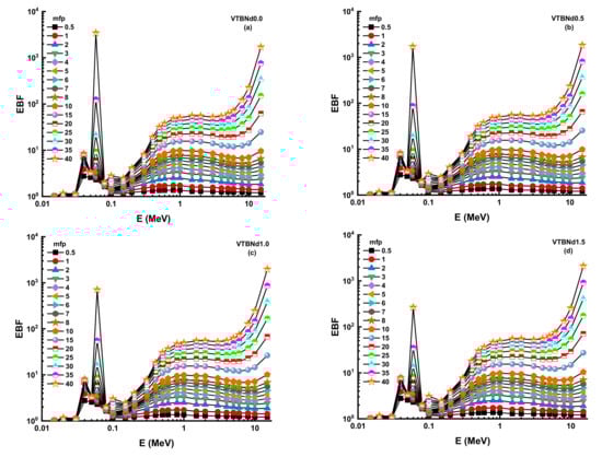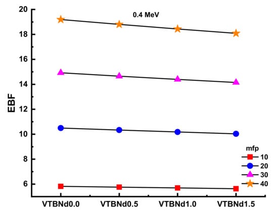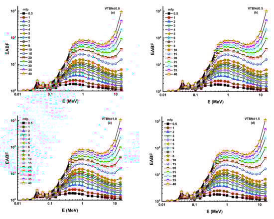 Thanks to its high-quality shading properties, Zeff values were greatest for the VTBNd1.5 glass sample. For example, Zeff values for VTBNd1.5 were 34.80, 35.13, 35.46, and 35.78 for the VTBNd0.0, VTBNd0.5, VTBNd1.0, and VTBNd1.5 samples at 0.15 MeV, respectively. However, the highest Zeff values were reported at 0.04 MeV as 50.44, 50.48, 50.52, and 50.55 for the VTBNd0.0, VTBNd0.5, VTBNd1.0, and VTBNd1.5 samples. The particle concentration in the medium is calculated, and then a radiation density correction is used in the equation to account for scattered radiation. Secondary ionizing radiation must be included in the overall calculation of buildup. The buildup factor is a multiplier compounded by the photon’s attenuation rate to calculate the photon’s total attenuation. The moderator allows for the disparity in the numbers of photons between the sources that makes up for their different intensities. Using the two sub terms of energy absorption, it can be classified into two forms of energy absorption factor, energy absorption buildup factor (EABF) and exposure buildup factor (EBF). In this study, EBF and EABF values were measured using a G-P fit approach from 0.5 to 40 mfp. The obtained fitting parameters along with their numerical values can be seen in Table 3, Table 4, Table 5 and Table 6. Figure 8a–e or Figure 9a–e display the calculated EBF and EABF values against photon energy for the VTBNd0.0, VTBNd0.5, VTBNd1.0, and VTBNd1.5 samples. Figure 8a–e or Figure 9a–e illustrate the concentration of the three distinct constituent layers of EBF and EABF due to photon radiation. Areas affected by gamma rays are important to the connections between radiation and matter. Since the photoelectric effect can be ignored near the binding energy of high atomic numbers, peaks can be observed in the first region. On the other side, though, the third segment of the sample is the most interesting during pair growth, with the value declining due to absorption processes.
