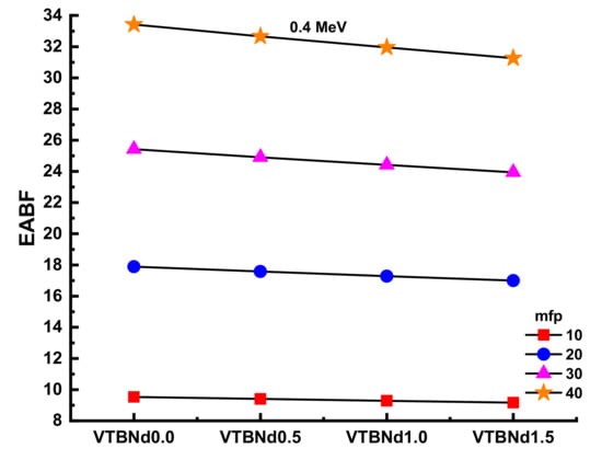 Figure 10 and Figure 11 display the changes in EBF and EABF values of studied glass samples at 10, 20, 30, and 40 mfp. These figures can also be considered as the dependency function of EBF and EABF values against glass structure. Figure 10 shows that VTBNd1.5 has the lowest EBF and EABF values with its superior shielding properties among the investigated glasses. The same pattern was also seen for the EABF value. The minimum EABF values recorded for sample VPBCd8 were found at all mfp values. Analysis was conducted to compare the EBF and EABF values for a set of glass formulations based on mfp values such as 10, 20, 30, and 40 mfp. Figure 12 shows variation of energy absorption buildup factor (EABF) and exposure buildup factor (EBF) against effective atomic number (Zeff) at 1 MeV and 5 mfp for all glasses. It can be clearly seen from Figure 12 that the EBF and EABF is higher for glasses with high Zeff than for glasses with low atomic Zeff. It can be easily shown that there is a strict relationship between EBF values and the efficient atomic number.