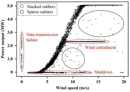 where P is the power output; v is the wind speed; A is the swept area of the impeller; and ρ0 = 1.225 is the reference air density. This step can eliminate the outliers that have higher power output than normal power points, e.g., data transmission failure in Figure 1. However, limited by the types of monitored parameters, only several kinds of outliers can be eliminated by preliminary data processing.