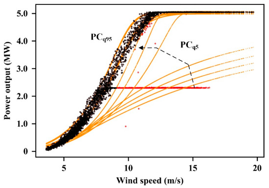 We calculate the distance between different fitting curves (d1 and d2 in Figure 2), and then use the ratio of them (d1/d2) to quantify the relationship of relative position between fitting curves. For example, in Figure 3a, when the wind turbine is operating normally, the distribution of power at a given wind speed is approximately symmetric about the mean, d1/d2 = 1.14. In Figure 3b, the stacked outliers increase the distance between PCq5 and PCq50 but the distance between PCq95 and PCq50 is basically unchanged because the outliers that has higher power output than the normal power points have been eliminated in preliminary data processing. In this case, d1/d2 = 5.90, which is much larger than 1 (ideal case). Therefore, we can determine whether there are outliers in the raw data by setting a specific threshold based on d1/d2. If d1/d2 > 1 + λ, the outlier filtering process will be executed. Hyperparameter λ as a margin added on the ideal case, which determines the end condition of the filtering process. If λ is too large, it is difficult to eliminate the power outliers, but if λ is too small, some normal data points will be regarded as the outliers. In this study, λ is set to 0.3 by the cross validation of multiple wind turbines. In some cases, however, λ needs to be fine-tuned according to the actual condition before deployment.