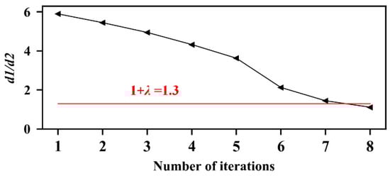 The relationship between d1/d2, and the number of iterations, where the red line is the threshold for the end condition of outlier filtering.