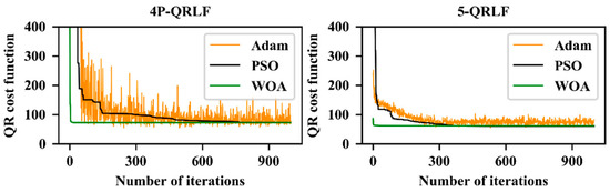 As shown in Figure 6, WOA has the fastest convergence speed in both 4P-QRLF and 5P-QRLF, followed by PSO. However, Adam algorithm is difficult to converge, especially in the optimization process of 4P-QRLF. After 1000 iterations, the values of QR cost function of 4P-QRLF optimized by PSO, WOA and Adam are 72.6, 72.7 and 98.3, and the values of 5P-QRLF are 60.6, 62.2 and 83. Although the test results might be inconsistent in the repeated experiments, they generally have the same trend.