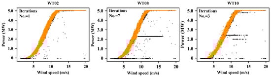 Before outlier filtering, we can clearly observe the stacked outliers caused by wind curtailment from WT08 and WT10, and few sparse outliers in the scatter plot of WT02. After outlier filtering, both sparse and stacked outliers are eliminated, while most normal data points are reserved. Among them, outliers caused by zero power output are filtered by using the monitoring parameters of the SCADA system (the first step of the proposed outlier filtering method), and then the remaining outliers are eliminated via the iterative calculations based on 5P-QRLF (step 2 to step 4). The proposed method has a certain adaptive processing capability, which can determine the number of iterations according to the number of outliers. As shown in Figure 7, after seven iterations, the outlier filtering algorithm of WT08 reaches the end condition, but for WT02, only one iteration is needed. This feature can significantly reduce the computing cost, e.g., under the same conditions, the computing time of WT08 is 181.7 s; this is more than seven times of that of WT02, i.e., 23.8 s.