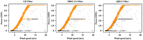 Results of outlier filtering by GP-Filter, DBSCAN-Filter and QRLF-Filter, where the black points are the raw data of power outputs, and the orange points are the power outputs after outlier filtering.