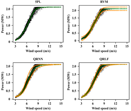 This part compares the proposed QRLF method (5P-QRLF optimized by PSO) with 5PL, RVM and QRNN to comprehensively evaluate the model performance. In order to avoid the impact of individual cases, we randomly select five wind turbines from each wind farm for testing. On the one hand, MAPE and NRMSE are utilized to evaluate the deterministic fitting accuracy of the aforementioned fitting methods; on the other hand, we use PICP, PINAW and NC to test the performance of the predicted CI. Table 5 lists the average values of the fitting results of each wind farm, and Figure 9 shows the detailed information of one of the test wind turbines.