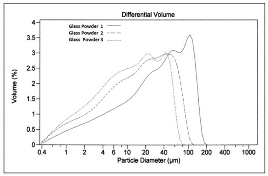 Differential particle size distribution of the 3 batches of glass powder [32].