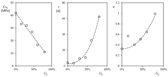 Coefficients of Equation (1), Cs0, τ, and n, plotted in relation to the amount of glass powder used to replace the cement, Gp. The corresponding lines of tendency (Equations (3)–(5)) have been plotted as dashed lines.