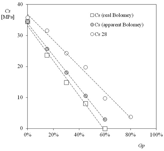 Compressive strength, Cs, 28 days after setting, with regard to the amount of glass powder used to replace the cement (Gp). The results are compared to the Bolomey (real and apparent) corresponding ones. The determination coefficients of the linear fittings are R2 = 0.988 (CS 28); R2 = 0.999 (CS apparent Bolomey); R2 = 0.993 (CS real Bolomey).