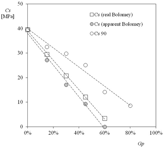 Compressive strength, Cs, 90 days after setting, with regard to the amount of glass powder used to replace the cement (Gp). The results are compared to the Bolomey (real and apparent) corresponding ones. The determination coefficients of the linear fittings are R2 = 0.973 (CS 90); R2 = 0.993 (CS apparent Bolomey); R2 = 0.999 (CS real Bolomey).