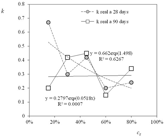 Taking into account the precision of these measurements, two average values of ‘k’ can be obtained, one for substitutions lower than 50% of CEM I 52.5 R cement for glass powder, and the other for substitutions higher than 50%.