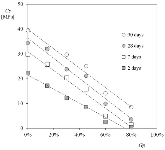 In 1935, Bolomey gave a formula to predict the compressive strength of cement mortar, which expresses a linear relationship between the water–cement ratio and compressive strength. This expression indicates that compressive strength of cement-based materials is mainly dependent on the water–cement ratio among all the other factors. Therefore, it is seen as a mathematical form of water–cement ratio law. In this regard, based on Fernández Cánovas studies [25], a calculation of theoretical compressive strengths at 28 and 90 days was reported using Bolomey’s dosage, introducing a coefficient k that represented the replacement of cement CEM I52.5 R by glass powder.