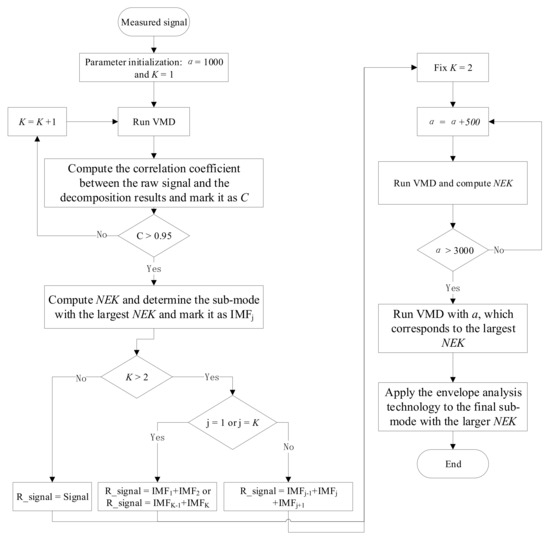 A novel method called residual-VMD (RVMD) is proposed in the current study to fill the above gaps. RVDM is designed to have two stages. In the first stage, the balance parameter is set as 1000 following previous studies [26,29]. The modal number is initialized as one and increases gradually until the relationship correlation between the input and decomposition results reaches the threshold. A new kurtosis, which is redefined on the basis of the number of elements whose values are above the root mean square (RMS) of the squared data, is applied to rebuild EK which can effectively evaluate the ratio of the periodic impulses in each mode. By keeping the mode with the largest new EK, and its neighbors, the VMD has two modes in the second stage. An iteration process is also applied to determine the optimal balance parameter. After obtaining the optimal balance parameter, the VMD is re-run with it. The sub-mode with the larger new EK is analyzed by envelope analysis technology to observe the fault feature. The effectiveness of the proposed method is examined by simulation and experiment signals. The comparison results among three other methods indicate the superiority of the proposed method.