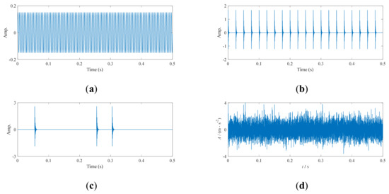 Simulation signal: (a) harmonic component , (b) periodic impulse component , (c) interface impulse component , and (d) composite signal .