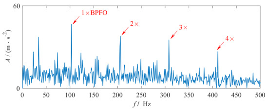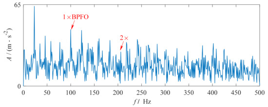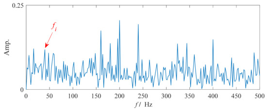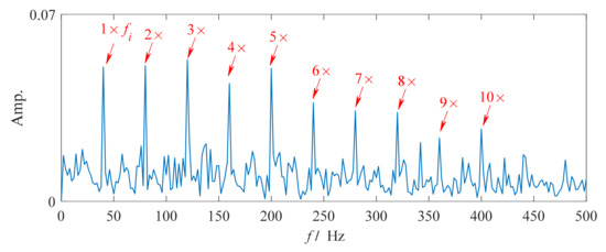 The proposed method was applied to analyze this signal, and the results are shown in Figure 5 and Figure 6. The time-domain waveform (TDW) shown in Figure 5b includes some periodic impulses, consistent with the results shown by NEK. The SES of the sub-mode shown in Figure 5b is presented in Figure 6. The fundamental frequency and its harmonics are clearly shown in it. Thus, the proposed method can effectively extract the periodic impulse features and it has a strong resistance against the interferences from the aperiodic impulses.