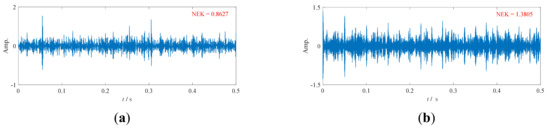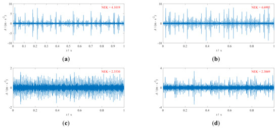 where is defined as the ratio of the number of elements whose values are above a specific threshold to the data length. Generally, the threshold can be defined as the mean of the data. However, the RMS of is applied in this study because of two reasons. First, each of the data is squared in Equation (10). Thus, the data are reasonably evaluated as . Second, the RMS can reflect the large aperiodic impulses more effectively than the mean. The relationship between the RMS and the mean can prove this reason. For a digital signal, their relationship can be written as: