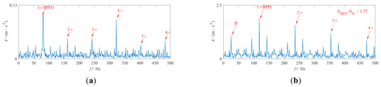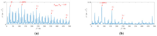 Then, the proposed method is applied to process this signal, and the results are shown in Figure 8 and Figure 9. The second sub-mode of the results from the RVMD for the inner race fault signal has the larger NEK, as shown in Figure 8. Accordingly, it should be processed by envelope analysis technology. On the basis of the results from the outer race fault signal, the first sub-mode should be analyzed further, and their results are shown in Figure 9. The results shown in Figure 9a are extremely similar to the raw SES shown in Figure 7b. To describe the differences clearly, the ratio of the largest amplitudes between the fault feature frequency and interference frequency (IF) is applied in this study. A larger ratio means a better fault feature extraction result. Based on the ratios shown in the two figures, we can say the inner race fault feature is efficiently enhanced by our method. By comparing the results shown in Figure 7d and Figure 9b, only the primary fault frequency and 2× can be found in the raw SES, but the primary fault frequency, 2×, 3×, 4×, 5×, and 6× can be found from the result by the proposed method. Consequently, RVMD can efficiently extract the bearing fault feature.