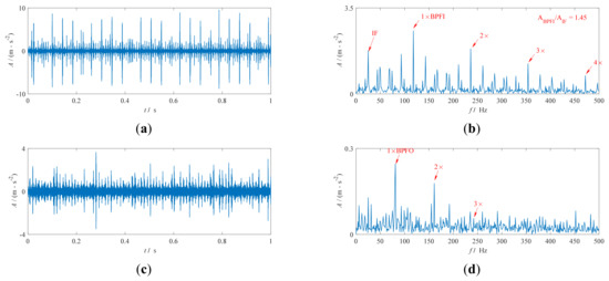 Results by the RVMD for the signals from MFPT: (a,b) correspond to the first and second sub-modes of the inner race fault bearing; (c,d) correspond to the first and second sub-modes of the outer race fault bearing.