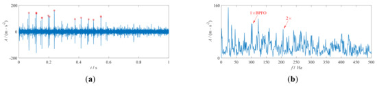 The signal comes from the Curtin University [34]. The type of test bearing is MB ER-16K, and a local defect exists in its outer race. This signal is marked as CU-O in this study for convenience. The shaft speed is 1740 rpm, and the BPFO is 103.6 Hz. The sampling frequency is 51.2 kHz, and the signal length applied in this study is 1 s. The TDW and SES of the raw signal are shown in Figure 13. Some large interference impulses (marked by red points) are included in the measured signal, as shown in Figure 13a. The fault feature frequency and its harmonics are difficult to observe in the SES shown in Figure 13b. Then, the proposed method is applied to analyze this signal, and the results are shown in Figure 14. From it, the second sub-mode should be analyzed by envelope analysis technology to show the fault feature. The responding result is shown in Figure 15. The fundamental fault feature frequency and its harmonics are clearly shown in it, indicating that the proposed method has succeeded in extracting the bearing fault feature from the signal polluted by some large impulses.