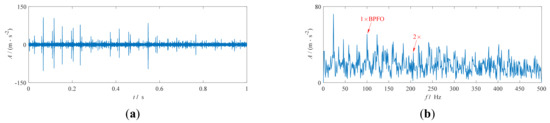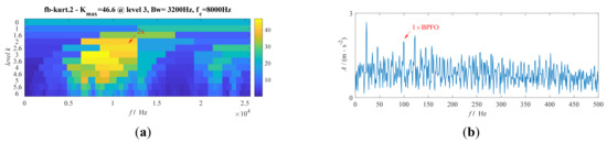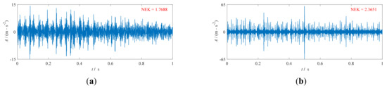 Rotation equipment has been widely used in modern industries, such as land transportation, ocean shipping, airlift, and some power transmission fields [1,2,3,4]. Although its strength and lifespan have been considered in the design stage, heavy loads and a terrible operating environment may accelerate the operating area deterioration (i.e., the interface between rolling elements and raceways in bearing and the meshing surface of two gears). Recent studies show the effectiveness of vibration signals in fault diagnosis [5,6]. Fault response of bearing and gearbox plays as impact component in vibration signal [7,8]. However, impulse response from the early fault is often submerged by noise from other running components and environments, given that the impulse response is too weak. Thus, an effective impulse signal detection method is necessary to evaluate the rotation machine’s operating status.