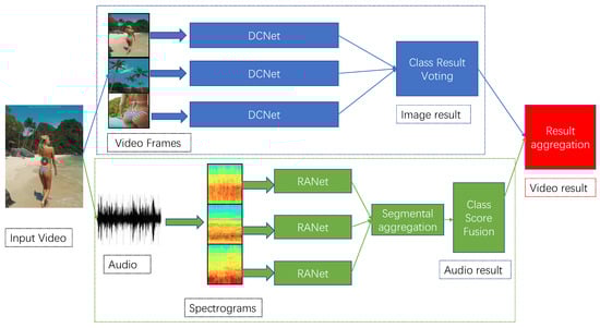 Although the last two decades have witnessed massive research devoted to recognizing pornographic images [5,6,7,8], pornographic video recognition is still an open problem. In general, the key information contained in the pornographic videos manifests itself in image frames and audio cues. Thus, these two modalities are usually extracted from the videos in the first place, and then handled separately for recognizing pornographic contents. On the one hand, the pornographic images exhibit significant intra-class variances when scenario, scale, and background change. In particular, the private part that distinguishes a pornographic image from normal images often accounts for a small local region, whereas the image background irrelevant to pornographic contents may consist of a large portion of the image area. Previous research [2,9,10,11,12,13,14,15,16] focuses on searching a naked person and detecting skin regions by using low-level patterns [17] such as texture, color, and geometrical features, whereas it is unreasonable to assume that all images with large skin areas are pornographic. With the success of deep convolutional neural network (DCNN) in image classification and detection [18], more attention has been paid to the application of DCNN in porn detection [3,19,20]. However, distinguishing the difference between sexy photos and porn images is still a challenging task. On the other hand, massive pornography videos can just be accurately recognized by its audio information alone, while some videos with periodic screaming and moaning cannot be understood by image content, since no pornographic images are shown explicitly. Therefore, fusing pornographic audio and visual information is significantly beneficial for improving recognition accuracy. Despite massive efforts devoted to environmental sound classification (ESC) [21,22,23,24,25] in the audio domain, it is well known that few research focuses on recognizing pornographic audio. The most popular strategy aims to perform the feature embedding obtained by pre-processing an audio signal and subsequently delivers the resulting features to DCNNs.