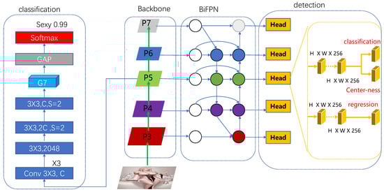 Figure 3 illustrates the architecture of DCNet for distinguishing the pornographic images in the video clips. To be specific, the network can be divided into four modules: The backbone, the bidirectional feature pyramid network (BiFPN) [26], the detection network, and global classification network.