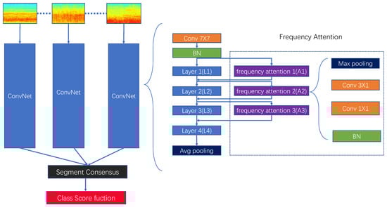 The RANet architecture for pornographic audio detection. Inspired by Temporal Segment Networks (TSN) [28], K log Mel-spectrograms are generated from the audio data and delivered into the RANet. In addition, the frequency attention which contains three attention blocks is used for capturing the most important information in frequency domain. Thus, the recognition scores of K log Mel-Spectrograms are fused by the segmental consensus function for porn audio recognition.