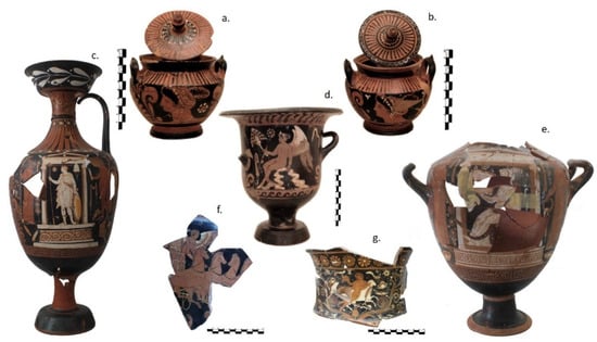 In this paper, the focus is on the Apulian (Southern Italy) red figure pottery (Figure 1) with the aim to integrate the data we obtained on finds from specific sites [,,,,,,,] into a more cohesive picture. Sections are assembled according to the type of information provided.
