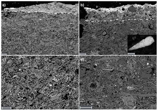 SEM-BSE photomicrographs of thin sections of the ceramic body of the krater dell’Amazzonomachia: basin (a), handle (b) (Inset: crystal of lead silicate inside the paste.), the cercine (c) and the neck of Loutrophoros (d). Scale 30 micron. Dashed lines separate the ceramic body and the surface decoration: the traditional black gloss and the repaintings on it (brighter) (a), the layer based on Pb newly formed silicates, Mn and Sn simulating the traditional black gloss (upper) (b).