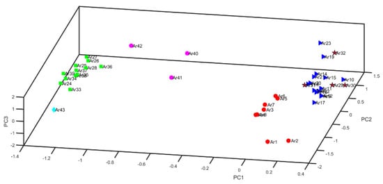 Scores plot (PC1, PC2, and PC3) of the NLPCA model for samples from Arpi (blue triangles and magenta circles: vases seized by the Guardia di Finanza of Foggia, red stars edged in black: sporadic fragments from ONC28 tomb of Arpi, green squares: vases from tomb of Niobids, red circles: vases from Tomba 5/2005, cyan diamond: vase from Tomba 4/2005). The fitting values obtained are 0.84 and 0.40 for R2 and Lof, respectively. The parameter R2 is closer to 1 than Lof to zero, confirming a high noise contribution.