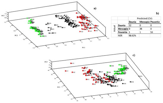 (a) Scores plot (PC1, PC2, and PC3) of the NLPCA model for samples belonging to three different areas of Apulia (Peucetia (black: triangles Conversano, squares Monte Sannace, circles Ruvo di Puglia, diamonds Altamura), Messapia (green: triangles Taranto, circles Egnazia) and Daunia (red: circles Arpi, triangles Canosa). (b) Confusion matrix and NER value for the LDA model built considering as priori classes Daunia, Messapia, and Peucetia. (c) Scores plot (PC1, PC2, and PC3) of the PCA model. Samples labelled as NLPCA model (a).