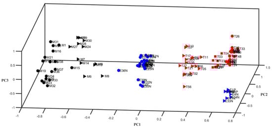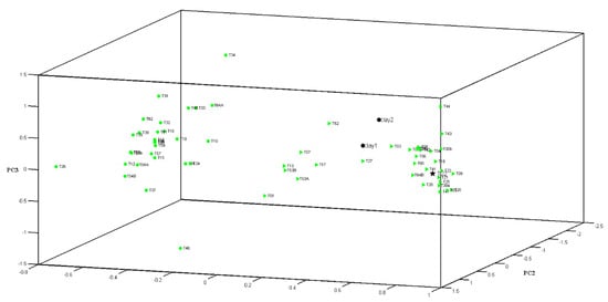 Chemical analysis allows to discriminate samples from the same site, according to the employed production technology []. Figure 11 shows the results obtained from the NLPCA analysis for the samples of three sites—Monte Sannace, Egnazia and Taranto—in which the presence of the two different production technologies has been highlighted. It is evident that the samples differ in provenance and, in case of the same origin, in production technology. The R2 value of 0.86 and the Lof of 0.37 show that the best fitting model is built with 3 PCs.