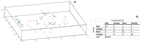 (a) NLPCA scores plot for the first three PCs related to the finds from Arpi (red), Canosa (magenta), Taranto (green), and Ruvo (blue). The R2 and Lof of the model with 3 PCs were 0.83 and 0.41, respectively. The samples attributed to Dario’ painter, found in the same sites, are labelled by stars. (b) Confusion Matrix and NER value for the classification model built with LDA considering as a priori classes Arpi, Canosa, Taranto, and Ruvo.