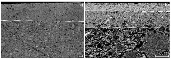 SEM-BSE photomicrographs of thin sections of fragments from Taranto (a) and Monte Sannace (b). The dashed lines separate red engobe layer (upper) from ceramic body (lower), showing the more compact and finer paste of engobe layer with respect to the ceramic body. Scale 100 micron.
