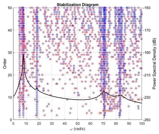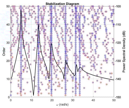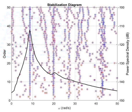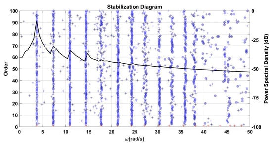 The system order α is selected, which refers to the stabilization diagram in this study. The number of frequencies in the signal is evaluated by spectrum and whether the order is sufficient for identification is judged according to the stabilization diagram, but only the frequency can be used as a reference. The accurate damping ratio or mode shape cannot be identified by the order. Reference [] indicates that parameter α (number of columns of Hankel matrix) and β (number of rows of Hankel matrix) shall be intercompared, and the difference shall not be too large. Therefore, the parameter β must be adjusted appropriately when selecting α.