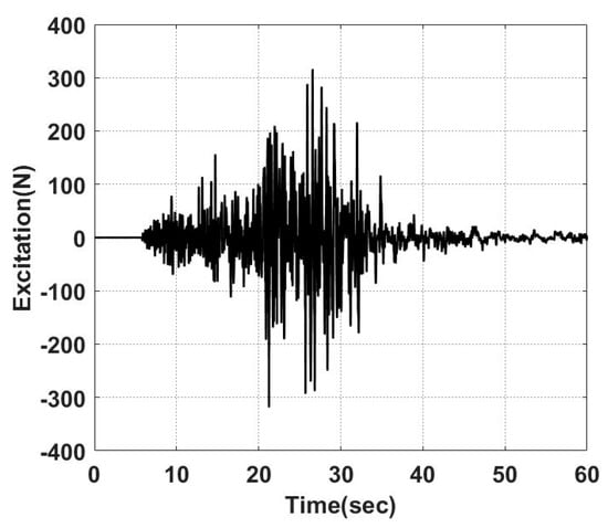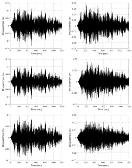 The damping matrix of the system is proportional damping (i.e., the linear combination of mass matrix and stiffness matrix ). It should be mentioned that the proportional damping matrices are suitable for modeling the behavior of most structural systems, in which the damping mechanism is distributed rather uniformly throughout the structures. The six DOF are excited by nonstationary white noise using the Newmark method and the initial state is stationary. To obtain the displacement response of the time domain, the time-domain sampling interval is 0.01 s, the number of sampling points is 131,072.