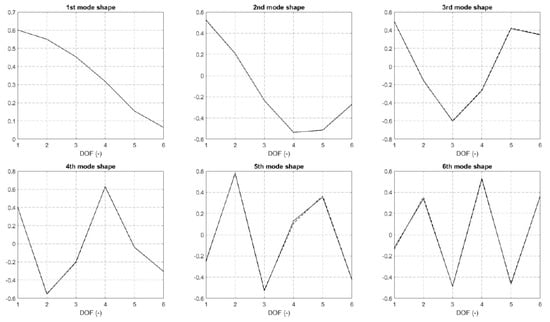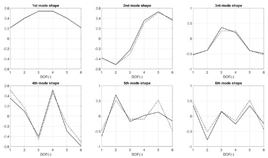 Mode shapes of six-DOF chain model of a cantilever beam (the solid line is an analytic solution, the dotted line is ERA/DC identification result).
