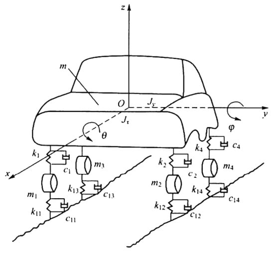 To demonstrate this method applicable to complex structure systems, a car model with two groups of closely spaced modes is considered, as shown in Figure 11. The system is a seven-DOF system, including car body bounce, pitch, and roll. Each of the four wheels represents a DOF and has the dynamic behavior of bounce; related parameters are shown in Table 3. The mass matrix , stiffness matrix , and damping matrix of the system are expressed as follows.