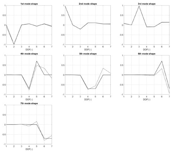 Mode shapes of seven-DOF car model (the solid line is an analytic solution, the dotted line is ERA/DC identification result).