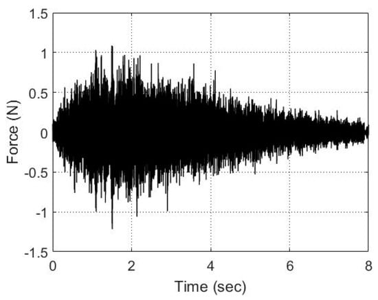To validate the effectiveness of the method proposed in this paper, an actual beam structure of free boundary is used for the experiment as shown in Figure 16. The Brüel & Kjær RT Pro Photon 7.0 data acquisition system, PCB 208C01 force sensor, and PCB 352B10 piezoelectric accelerometer are used for measuring response signal. The simulated nonstationary excitation is imported into the Modal Shop K20070E01 vibration exciter through Teledyne LeCroy T3AFG40 signal generator and the vibration exciter excites the free beam structure. Finally, the excitation signal and response signal are obtained by force sensor and accelerometer, as shown in Figure 17 and Figure 18. Currently, a roving accelerometer testing based on output-only modal estimation is implemented to extract the practical modal properties of the beam structure; nine measurement positions on the realistic aluminum alloy beam were marked and the shaker excitation impacts acted as the middle (fifth) location of the beam.