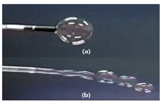 Figure 13a shows the appearance of soap bubbles beginning to come out of a large tube, which have a greater diameter than straws. It can be seen that the soap bubbles blowing out from the ends of the straw are larger than the straw, and that they sag downwards under the influence of gravity. Figure 13b shows the bubble’s appearance immediately after the soap bubble separates from the tube and Figure 13c shows soap bubbles coming out of the tube continuously.