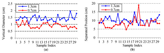 The vertical diameter and separated position of soap bubbles were determined by the shape and size of the tool blowing the soap bubble. Therefore, in this study, 30 experiments were conducted with straws with a diameter of 1.3 cm and straws with a diameter of 0.7 cm. Figure 3a shows the vertical diameter value extracted from the experiment when the soap bubble was blown. When using a 1.3 cm straw, the average diameter was 1.43 cm (SD: 0.18 cm), while for the 0.7 cm straw the average diameter was 0.91 cm (SD: 0.16 cm). The vertical diameter ranged from 1.24 to 1.6 cm for the 1.3 cm straw, and from 0.76 to 1.07 cm for the 0.7 cm straw.