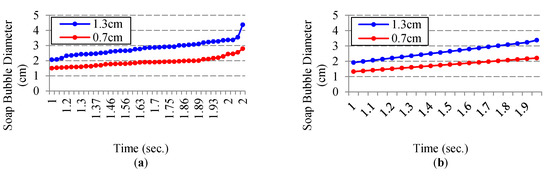 To measure the soap bubble diameter, we conducted an experiment using two cases: strong and fast blown bubbles, and weak and slow blown bubbles. First, it was observed that several small soap bubbles appeared in the case of strong and rapid blowing (Figure 4a). In the case of weak and slow blowing, one large soap bubble was observed (Figure 4b). The diameter was calculated over time using a machine learning algorithm [6]. The soap bubble diameter gradually increased over time. The soap bubble diameter using a 1.3 cm straw ranged from 1.92 to 3.37 cm, while for the 0.7 cm straw the values ranged from 1.32 to 2.21 cm. The error range in the value corresponding to each second shows a 0.5 cm deviation.