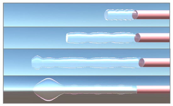 The soap bubble data measured through Section 3.2 are used to create it in initial 3D MAX in Figure 5a and then apply it in Unity. As for the procedure order, the 3D model was first created from the directly measured photos, videos, and data, and the starting shape and shape of the soap bubble were created using the 3D MAX tool, and the morphing was computed through the final animation. After that, the created FBX (Filmbox) file is loaded in Unity by coding, created to be called out at the desired size and speed, and the soap bubbles are separated and moved according to the laws of physics. Figure 5b is a schematic diagram showing how to design a soap bubble before making it. The soap bubble model of the straw was designed to be made by applying the point that the soap bubble pops out faster than when using other tools, and is divided into a cylindrical part that is blown out and a soap bubble part that becomes a circular model. The 0.7 cm straw and the 1.3 cm straws differ in size but used the same model. Since the soap bubble model of the tube comes out slowly, unlike the straw model, the distinction between the blown part and the soap bubble part is not necessarily distinctive. Therefore, the tube model was designed to produce one model in which the two were combined. The hoop soap bubble model was not tubular, but rather a thin circular type, so it was constructed as a model that occurs when the stick is swung. In reality, the hoop is swung in various directions, but in this study, the case where the hoop is swung in a straight line was specified and produced. Figure 6 shows the model that produced soap bubbles using the measured or predicted values. It can be seen that it comes out similar to a real soap bubble. It was filmed over time as soap bubbles were blown out from top to bottom.