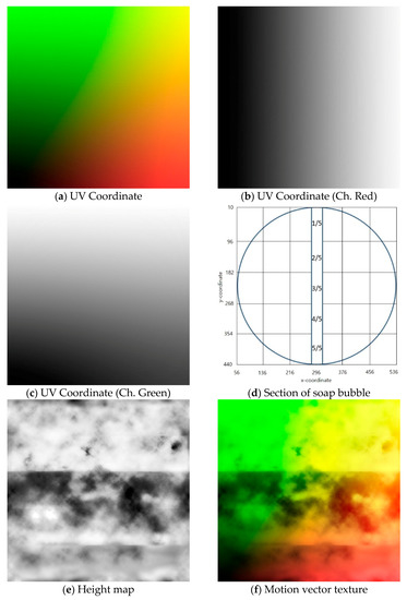 In a previous study, the authors reported measuring the flow speed of a physics-based soap film [19,20]. Based on this, we introduce an improved rendering method that reflects the speed of each section. Figure 7a shows the ‘UV Coordinate’ function of UV Mapping [21] that makes 2D textures into 3D models in a shaded graph, which is a node-based shading editor of Unity. UVW is the same coordinate concept as XYZ, and W is not used because it uses a 2D texture. Therefore, U is the X-axis and V is the Y-axis. As a result of separating each channel of UV, it can be seen in Figure 7b,c that each channel has a directional value of each axis by pixels from 0 to 255. Using this, the direction of motion can be determined by adjusting the color value of each pixel. In this study, a height map was used to determine the direction of motion. A height map is a 2D texture composed of grayscale and functions as displacement mapping with displacement information. The larger the displacement, the closer it is to white, and the smaller the displacement, the closer it is to black. In this study, Figure 7e was produced by dividing the soap bubble into five sections (Figure 7d) and optimizing the height map. Finally, a motion vector texture (Figure 7f), which can control the direction and speed through an overlay on the UV coordinate with the direction value and the height map with the displacement value, was produced through motion vector texture production.