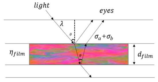 Soap bubbles are very light because they are formed of a very thin layer of soap that envelopes the air, and a small force produces a large change in a bubble. When this film receives light, the waves are reflected from the surface and inside. As shown in Figure 8, the color looks different depending on the viewing distance and angle of the viewpoint reflected by interference known as iridescence [23]. In this study, as a result of measuring the change in the flow shape and thickness of the fluid by observing the movement of the soap film, a soap bubble texture that can sample the flow shape, thickness and color values of the fluid was produced [24]. The formula in Equations (5) and (6) for this are as follows [25]: